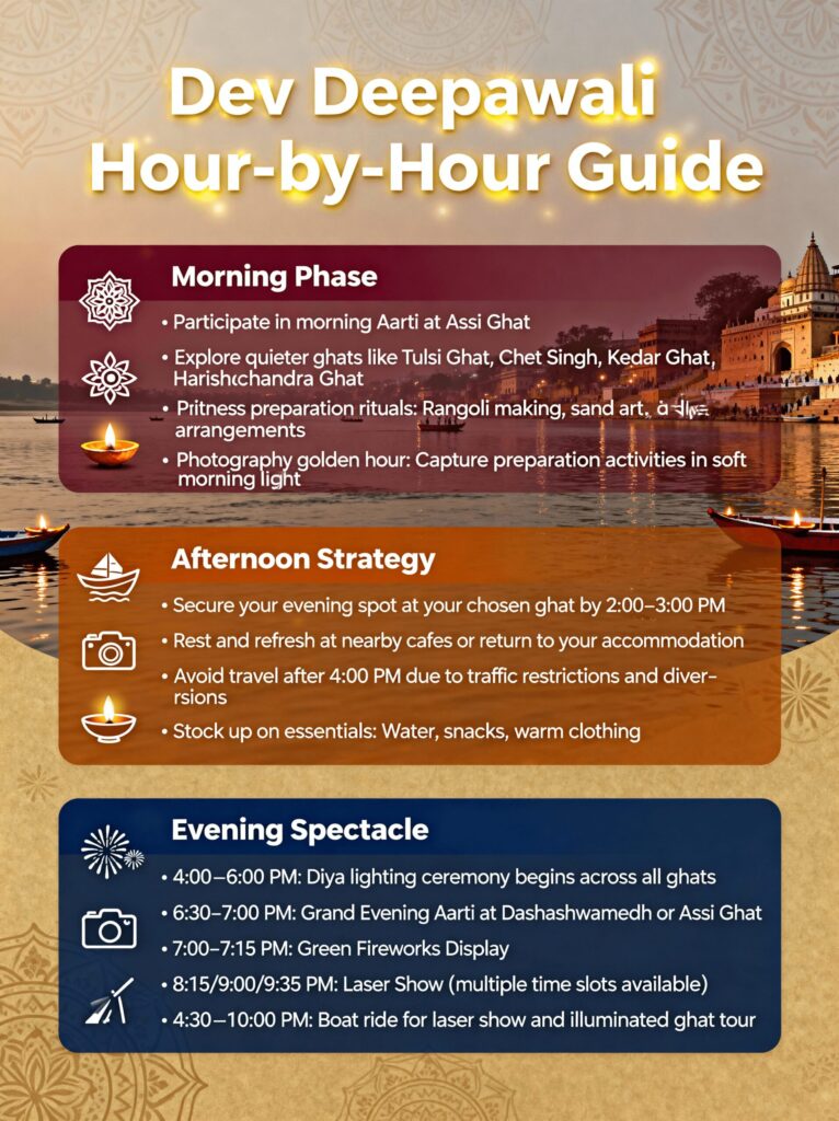 - Secure your evening spot at your chosen ghat by 2:00–3:00 PM